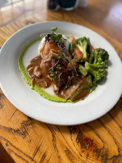 Lightly dusted chicken breast stuffed with three cheese blend, rosemary, and prosciutto. Pan seared and finished with brown gravy, Hamakua Ali’i mushrooms, and caramelized Maui onions. Served with mashed potatoes and fresh sautéed veggies.