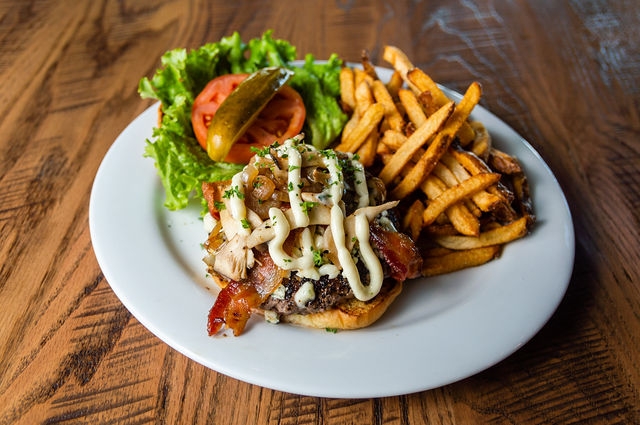 Seasoned and grilled 7oz grass-fed burger topped with caramelized Maui onions, sautéed Hamakua Ali’i mushrooms, bacon, and gorgonzola cheese crumbles. Finished with a roasted garlic aioli. Includes choice of one fresh side