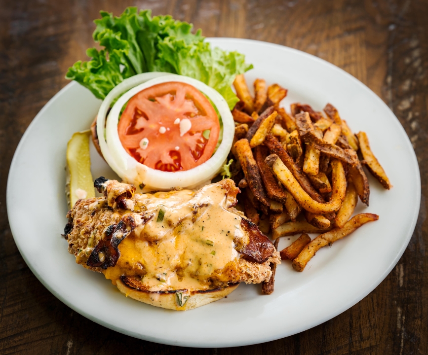 Spicy crispy Dijon chicken with house-made buffalo ranch. Topped with cheddar cheese and bacon on a brioche bun. Includes choice of one fresh side.