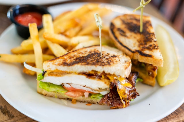 Served on toasted sourdough with marinated grilled chicken, cheddar cheese, candied bacon, and avocado herb spread with lettuce, tomato and Maui onion. Includes choice of one fresh side.