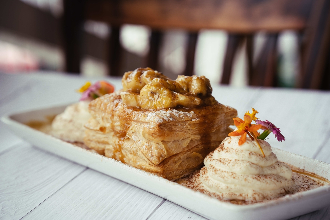 Buttery crispy puff pastry shell filled with house made vanilla pudding and bananas caramelized with local dark rum.