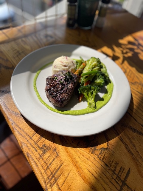 Grilled 6oz sirloin steak using our house seasoning served with garlic mashed potatoes and sautéed vegetables