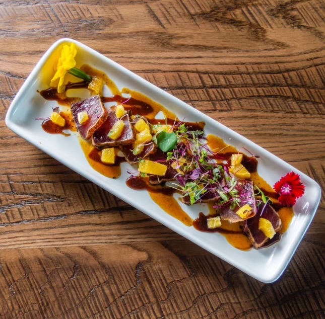 Ahi seasoned with Cajun furikake spice, seared rare, and thinly sliced. Served over lilikoi ponzu and spicy black bean shoyu, finished with diced oranges and microgreens.