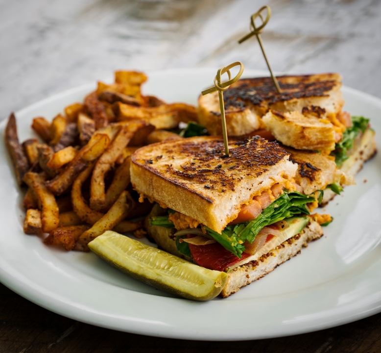 Fresh spinach, tomato, Maui onion, cucumbers, julienned carrots, roasted red peppers on lightly toasted sourdough bread with pimento cheese and Dijon mustard. Includes choice of one fresh side.
