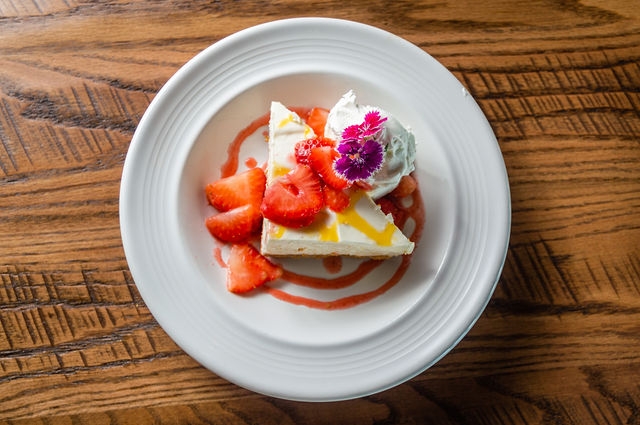 Graham cracker crusted scratch made no bake cheese cake with a lilikoi topping. Finished with whipped cream and strawberries