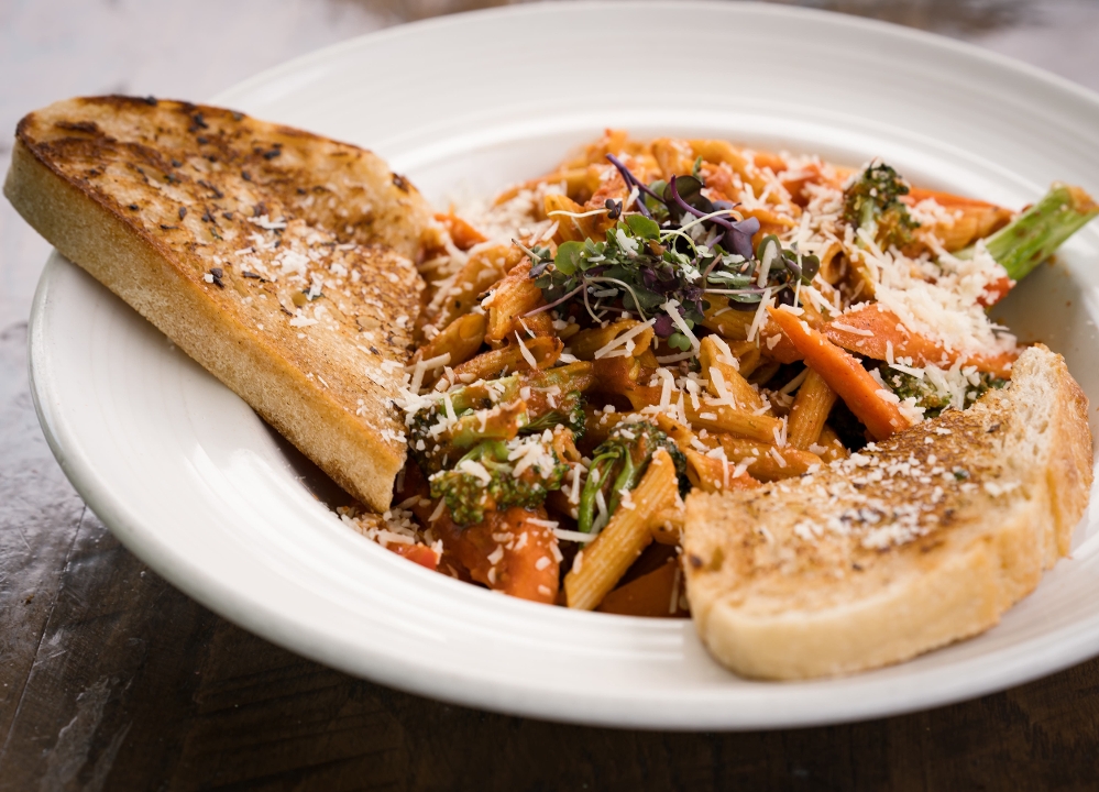 Penne pasta tossed in basil marinara with sautéed seasonal vegetables and topped with parmesan.