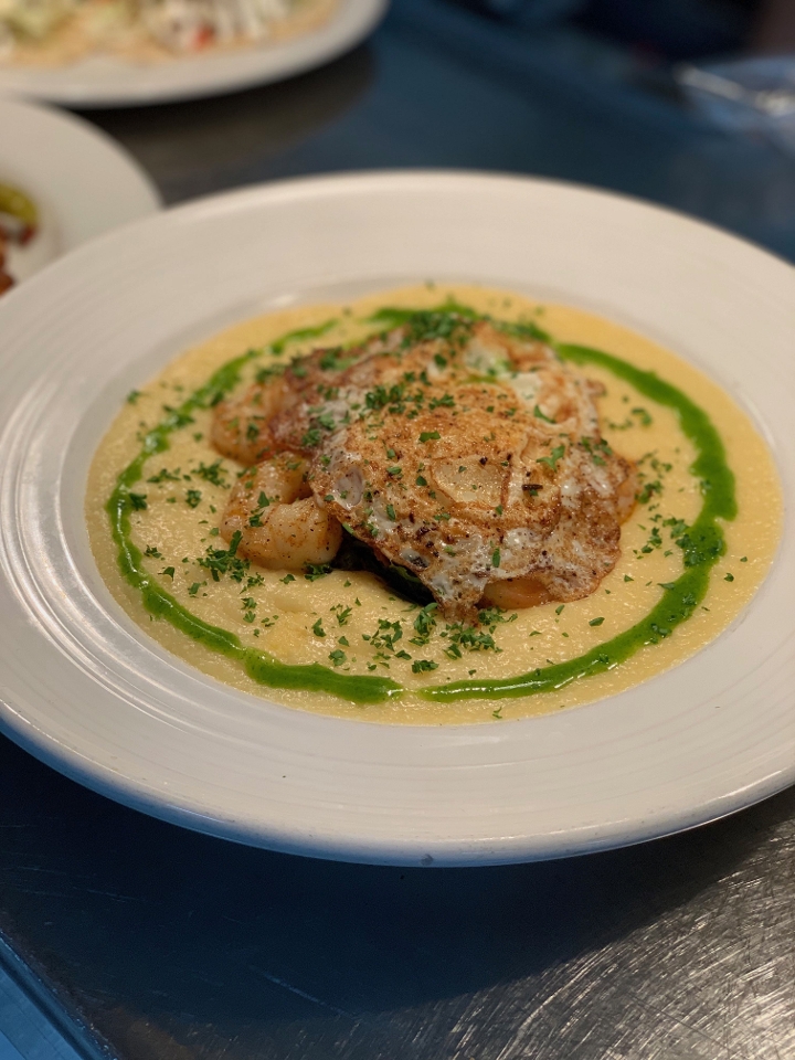 Cajun seasoned blackened shrimp and a fried egg served over creamy cheese grits and rainbow chard sautéed with bacon and caramelized Maui onions.