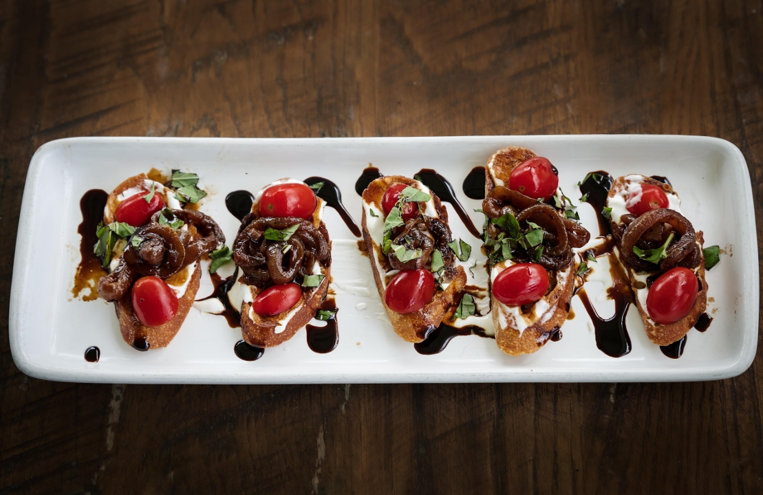 Crispy garlic crostini with a chèvre, cream cheese and garlic whipped spread, cherry tomatoes, caramelized Maui onion, basil, and a drizzle of balsamic reduction.