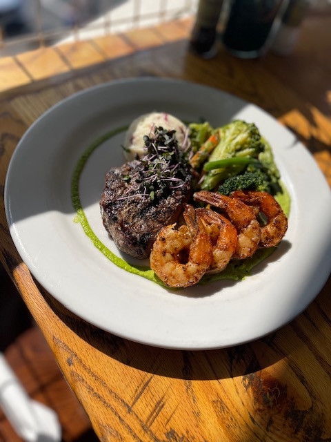 6oz sirloin steak and blackened shrimp served with remoulade sauce, garlic mashed potatoes and sautéed vegetables