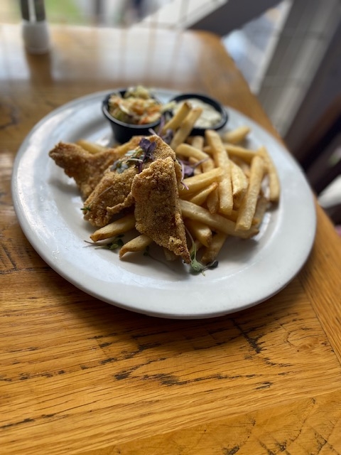 Country style cornmeal fried daily catch served with a side of slaw, tarter sauce, and house-made fries.