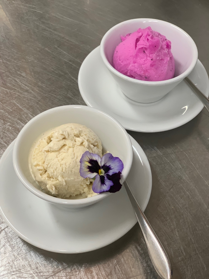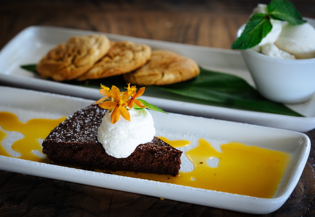 Rich dark chocolate torte served with a lilikoi glaze and vanilla whipped cream.