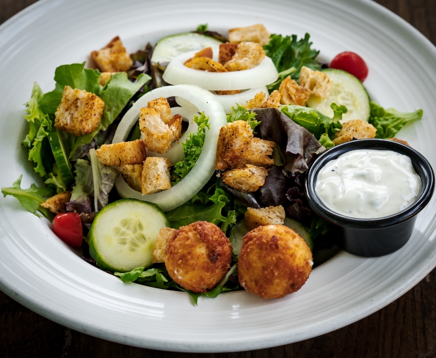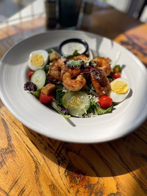 Fresh mixed greens topped with cucumbers, cherry tomatoes, hard-boiled egg, Maui onions, gorgonzola crumbles, candied bacon, Cajun croutons and blackened shrimp. Your choice of dressing.