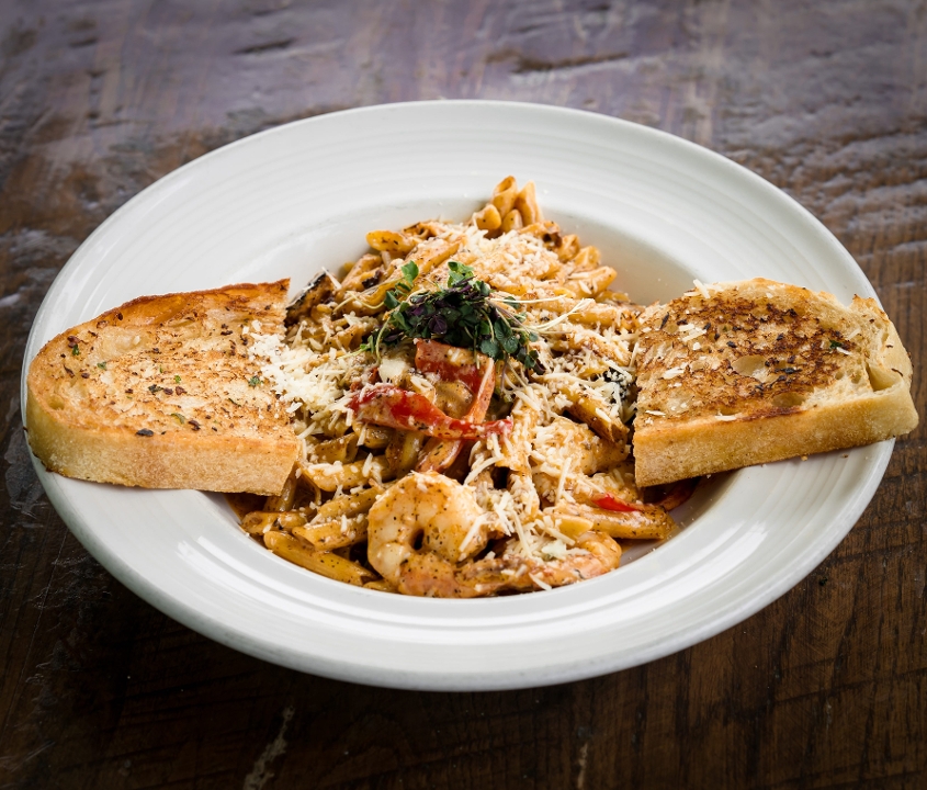 Penne pasta, blackened shrimp, Cajun seasoning, sausage, bell peppers, caramelized Maui onions, Hamakua Ali’i mushrooms, and cherry tomatoes in a brown butter cream sauce with a dash of parmesan.