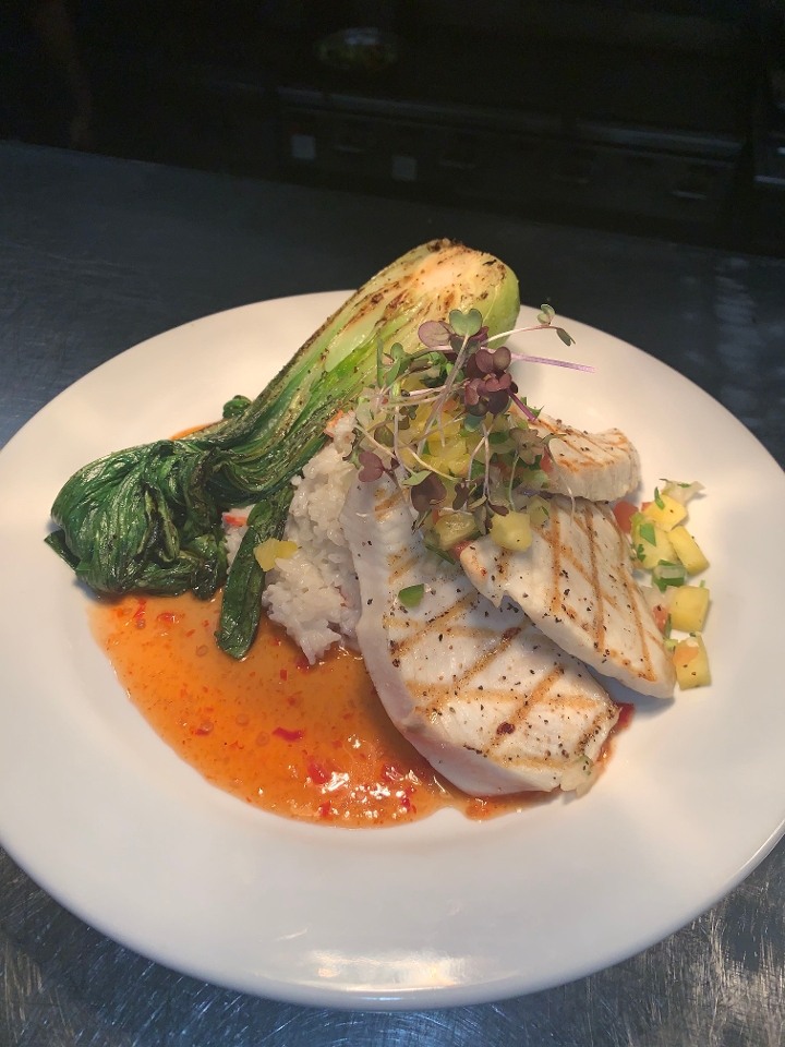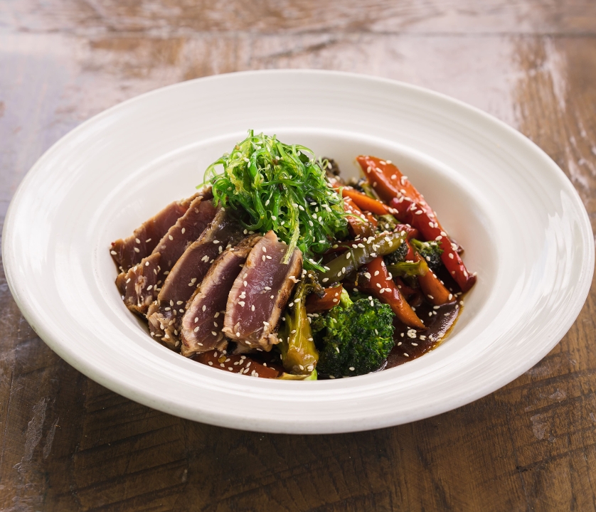 Local ahi marinated in a spicy Szechuan and seared medium-rare. Served on a bed of white rice surrounded by stir-fried seasonal veggies with seaweed salad and sesame seeds.