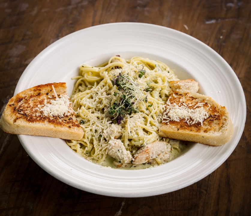Marinated grilled chicken tossed with linguine in a fresh Macadamia nut pesto cream sauce and finished with parmesan cheese