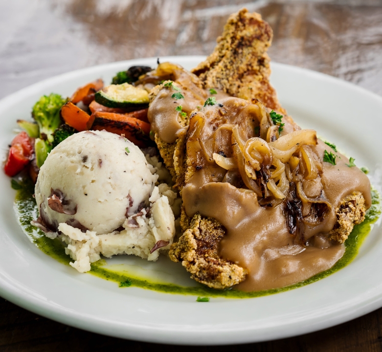 Lightly seasoned bone-in country fried pork chops over mashed potatoes and fresh sautéed veggies. Smothered with brown gravy and caramelized Maui onions.