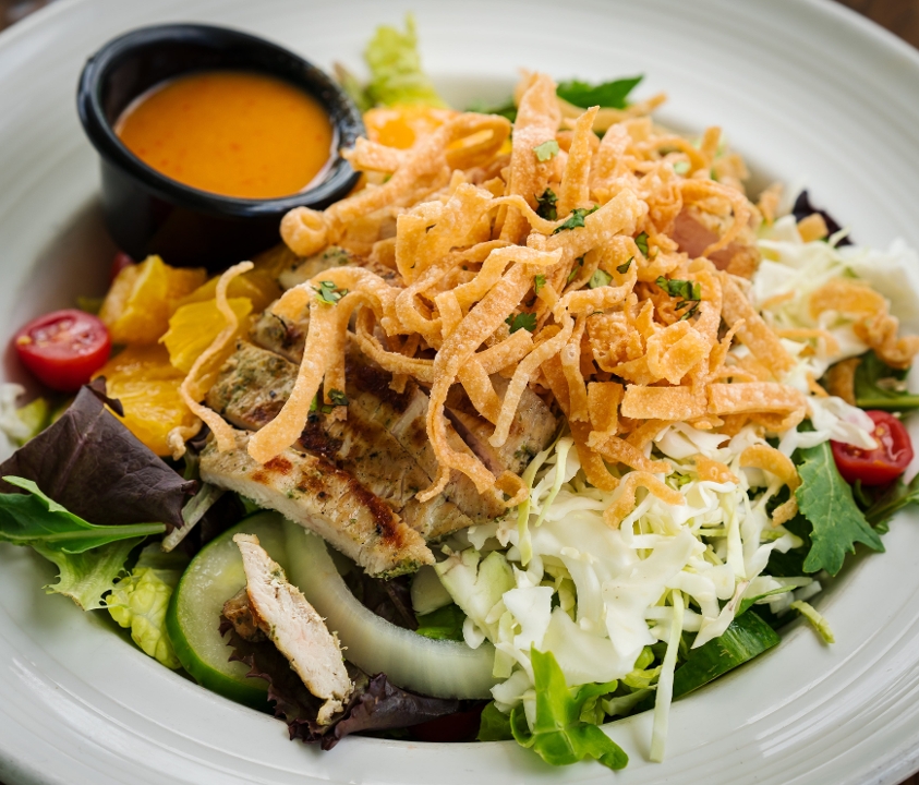 Grilled chicken over mixed greens, topped with green cabbage, Maui onions, tomato, cucumber, cilantro, basil, fresh oranges, and crispy wontons. Served with Chili Macadamia Nut Thai dressing.