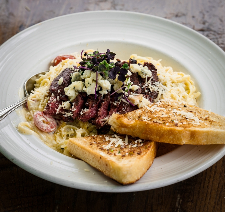 Linguine pasta tossed in a gorgonzola cream sauce with Hamakua Ali’i mushrooms, cherry tomatoes, spinach, and caramelized Maui onions. Topped with thinly sliced medium-rare grilled sirloin.