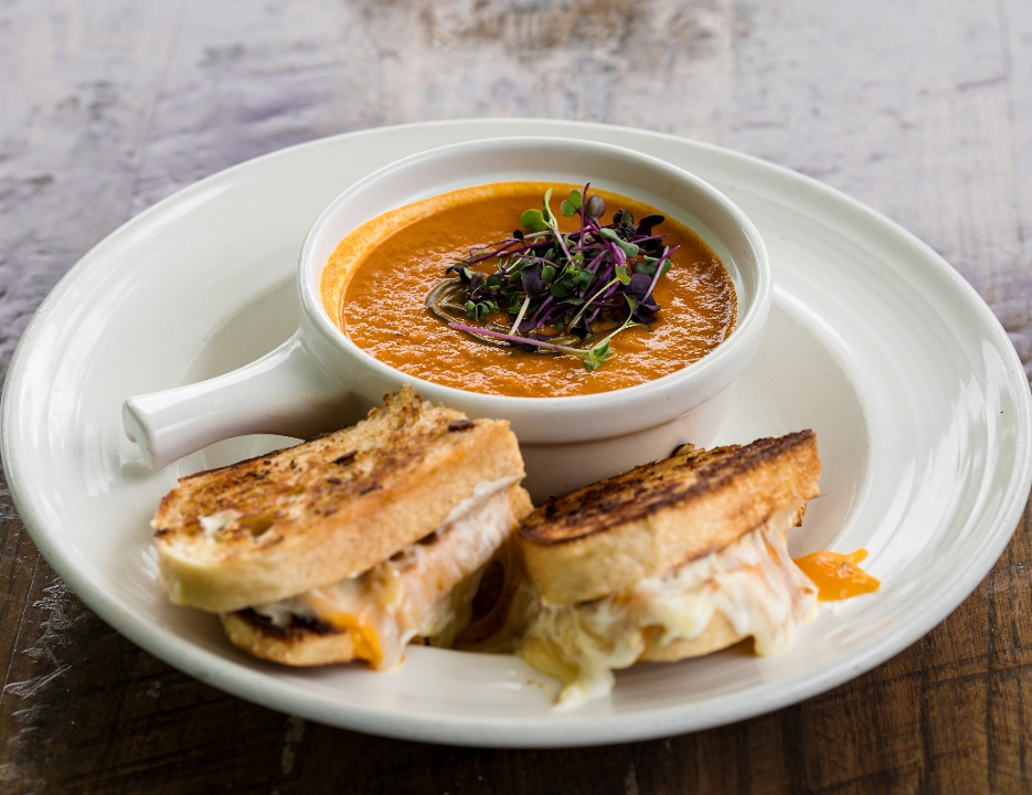 Hot savory tomato bisque topped with avocado mousse and microgreens. Served with gourmet grilled cheese with caramelized Maui onions on sourdough bread.